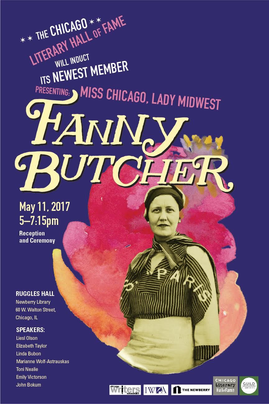 Fanny Butcher: (September 13, 1888 – May 1887), for four decades a writer and critic for the Chicago Tribune, will be inducted into the Chicago Literary Hall of Fame on May 11, 2017 at Newberry Library’s Ruggles Hall. Liesl Olson will give the keynote presentation, and John Bokum will accept the award on his aunt’s behalf. Elizabeth Taylor, Linda Bubon, Marianne Wolf-Astrauskas, Toni Nealie, and, Emily Victorson will also give tributes.